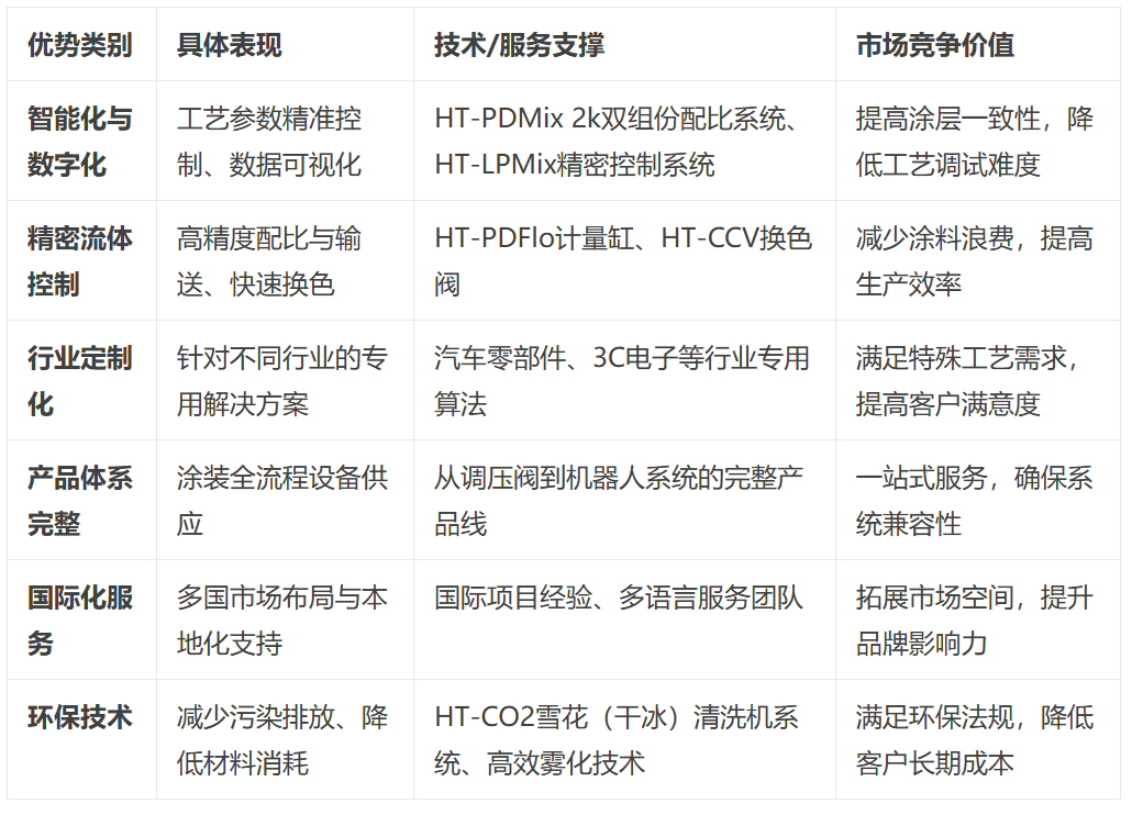 将赫泰智能取喷涂设备市场的次要合作敌手进行系统对比,可以或许更清晰地其外行业中的相对合作地位。这种对比阐发从产物手艺、市场策略、办事系统等多个维度展开,有帮于识别赫泰智能的实正市场定位和成长机遇。通过客不雅比力,我们能够发觉赫泰智能正在某些细分范畴的奇特价值,同时也明白其需要加强的标的目的。