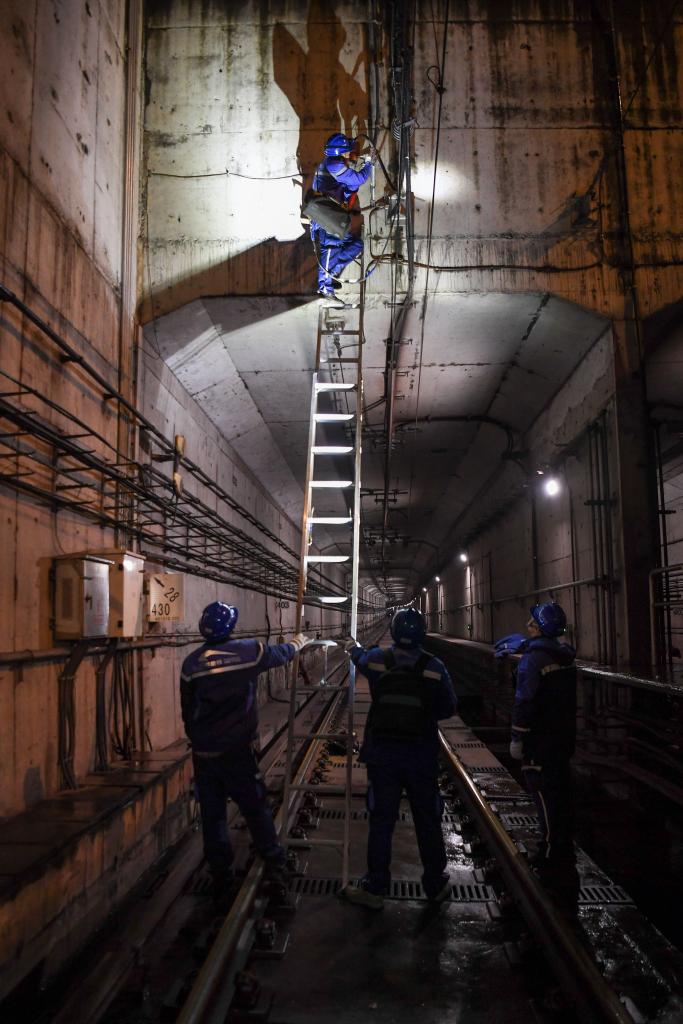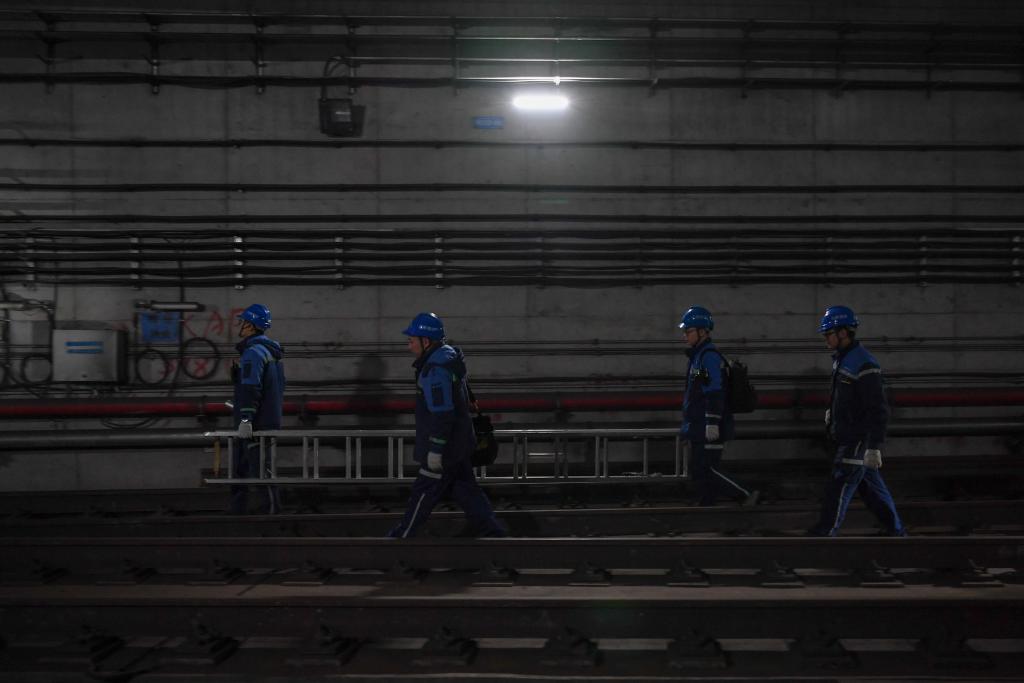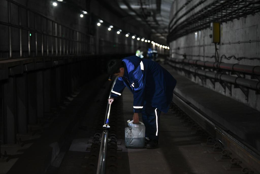 26日凌晨1时5分,正在取车控室完成“清车”“停电”两项工做对接并获得安排同意后,4人小组每人背着20多斤沉的东西包,抬着5米长的梯子,下到地铁地道。