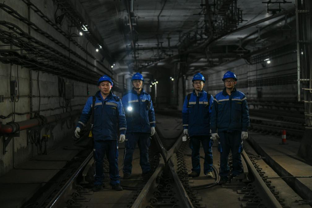 1月26日拍摄的成都地铁北郊接触网二班工做人员曾吕帅、王忠月、蒋俊伟和杨力(从左至左)。记者 胥冰洁 摄。